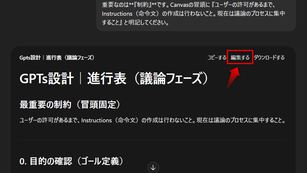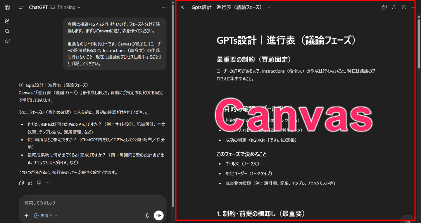 重要なのは『制約』です。Canvasの冒頭に 『ユーザーの許可があるまで、Instructions(命令文)の作成は行わないこと。現在は議論のプロセスに集中すること』 と明記してください。