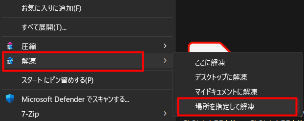 解凍場所はダウンロードフォルダ以外にしましょう。