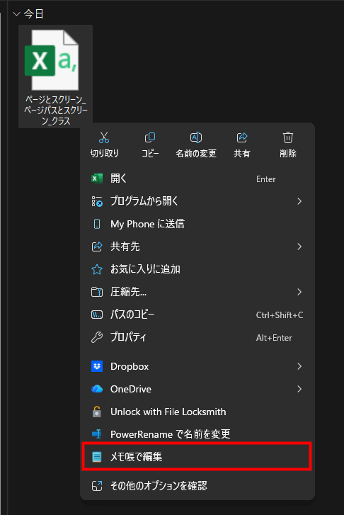 - エクスポートしたCSVファイルを右クリック >し、「メモ帳で編集」を選択します。