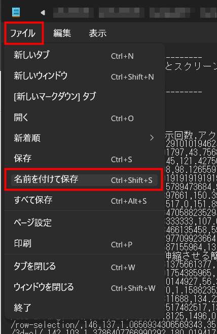 - 「ファイル」メニュー > 「名前を付けて保存」をクリックします。