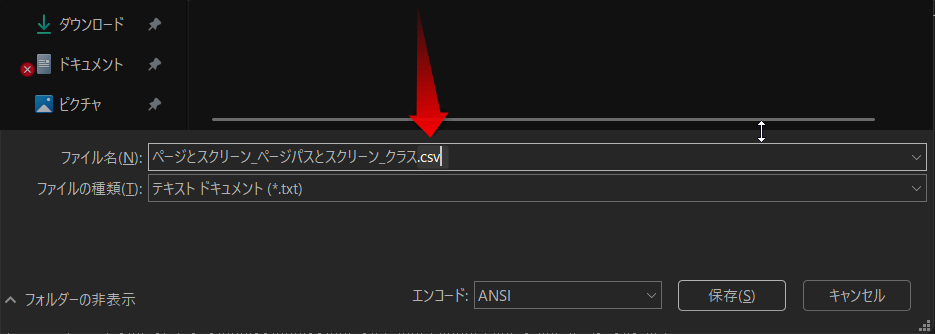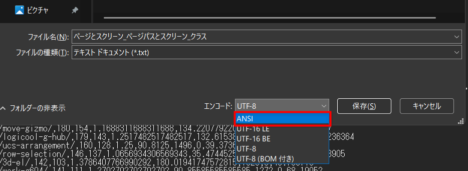 - 保存ダイアログの下部にある「エンコード」を「ANSI」に変更します。