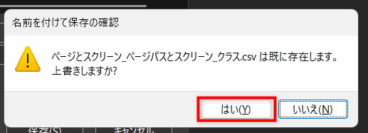- 「保存」ボタンを押すと、「既に存在します。上書きしますか?」と聞かれるので、「はい」を選択します。